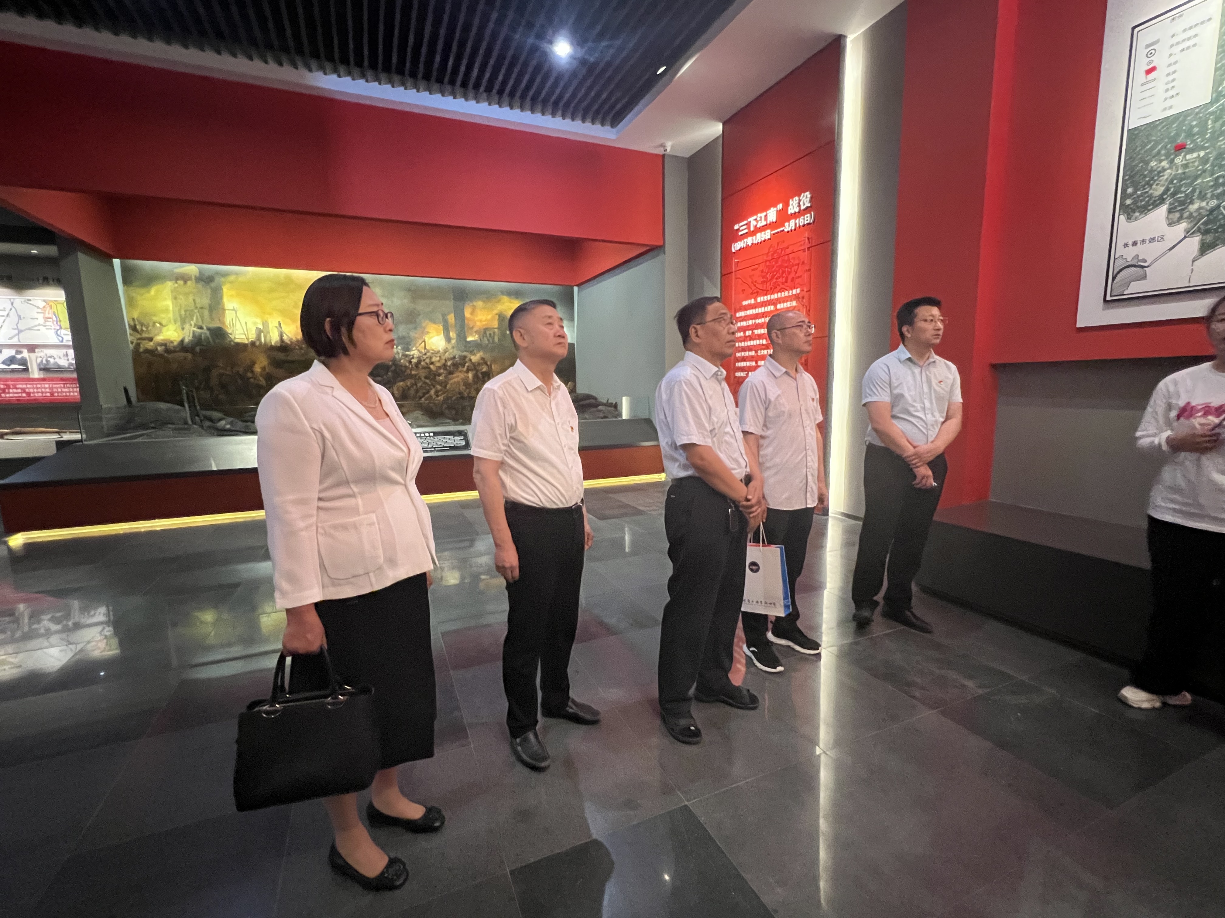 隨后,大家又來到一樓“三下江南”紀念展廳。1946年底,國民黨軍向東北民主聯(lián)軍南滿臨江根據(jù)地發(fā)起重點進攻。南滿我軍三縱、四縱和獨立師,于1946年12月17日至1947年4月3日間,展開“四保臨江”保衛(wèi)戰(zhàn)。而北滿我軍為配合南滿我軍作戰(zhàn),從1947年1月5日至1947年3月16日,三次南下松花江,對敵展開大規(guī)模軍事行動。展廳內通過主題展板、半景畫、浮雕等形式展現(xiàn)了這次戰(zhàn)役發(fā)生的歷史事件。