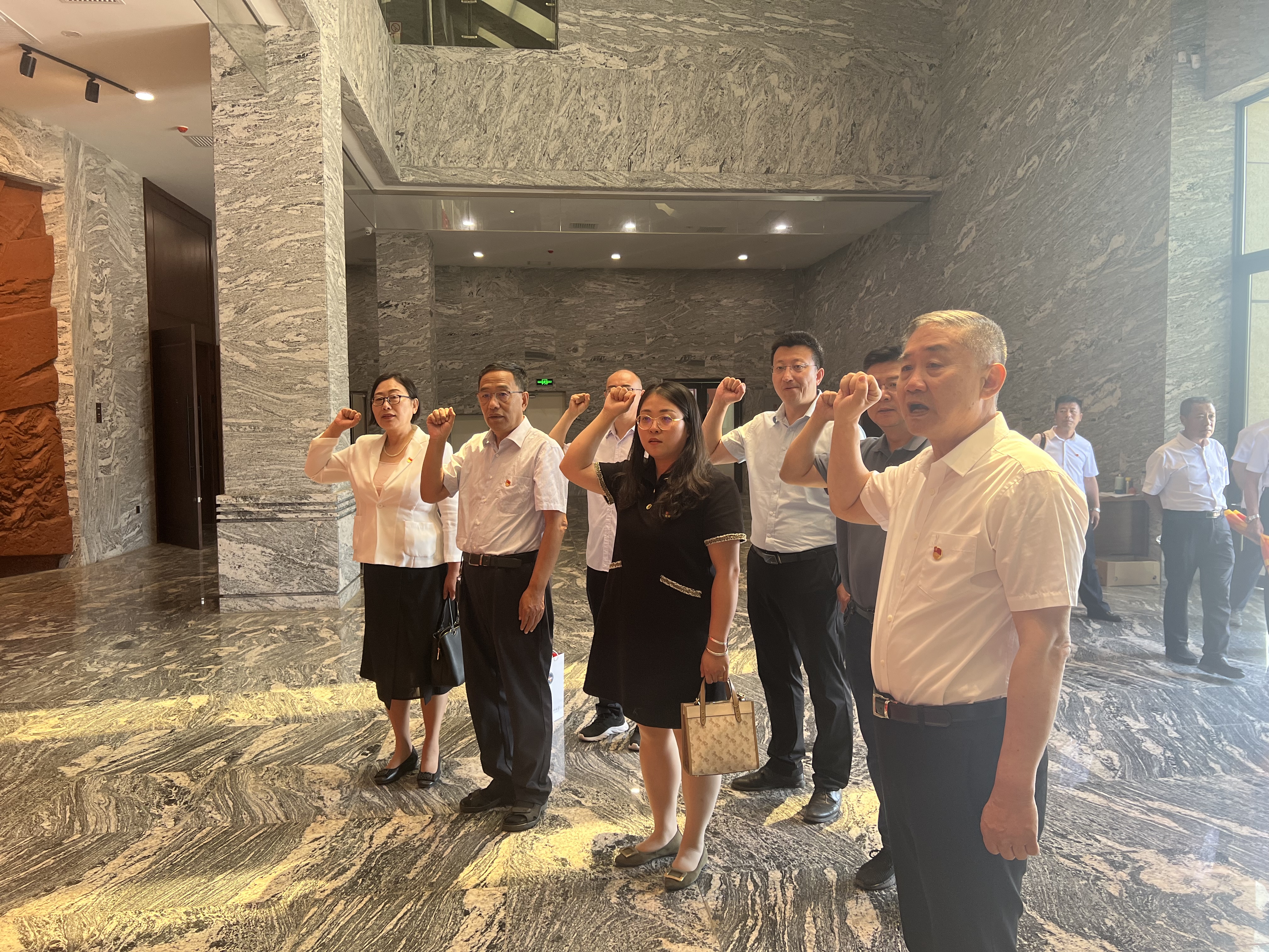 走出展廳,全體黨員在省協(xié)會黨支部書記郭洪勝的帶領下,面向黨旗重溫入黨誓詞,面對鮮紅的黨旗,高舉右手,字字鏗鏘,充分展示了全體黨員干部不忘初心、牢記使命的政治信念,牢記黨員的政治責任和歷史使命。