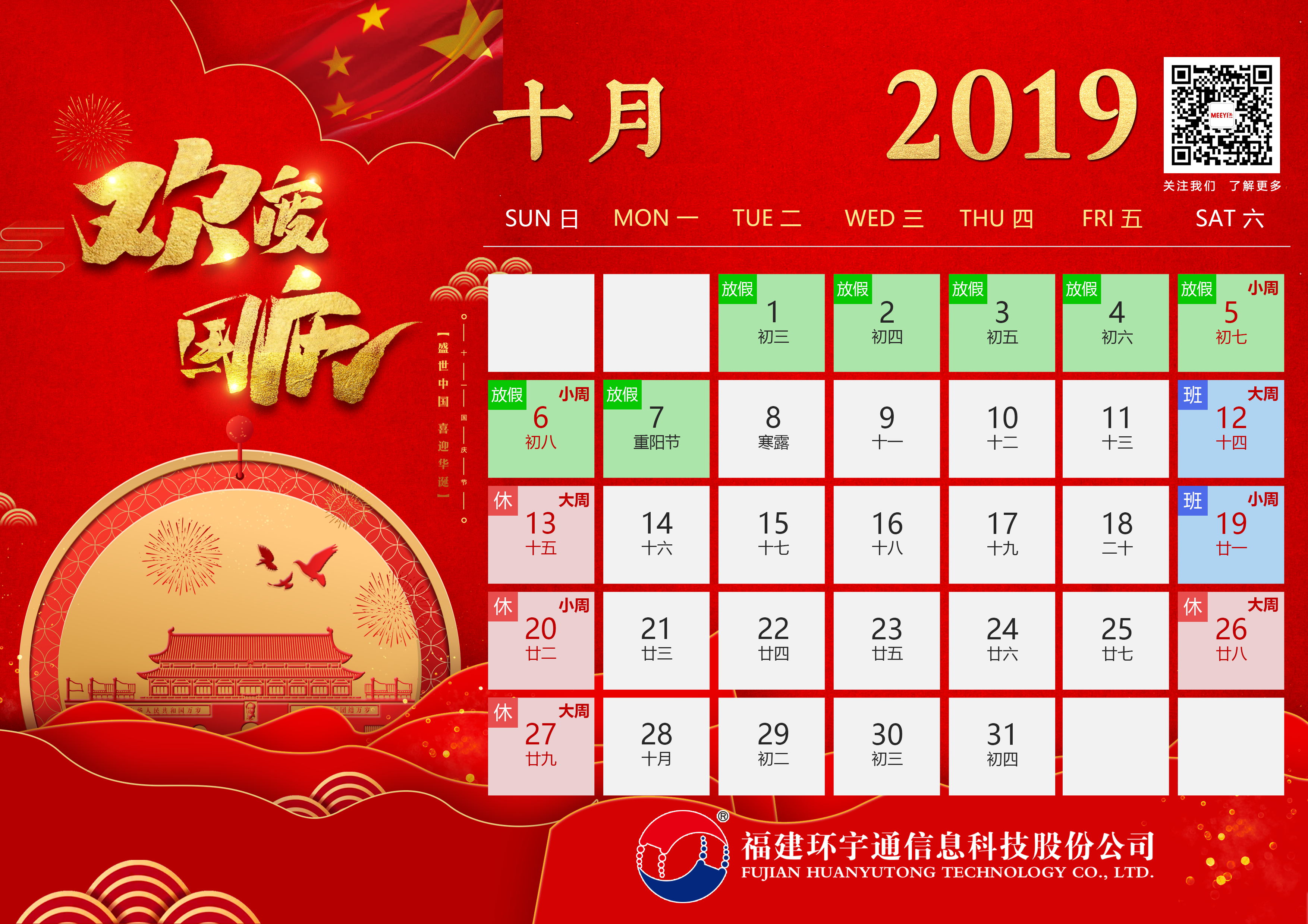 國慶佳節(jié)到來,祝愿祖國愈發(fā)繁榮富強,平安昌盛,同時也祝愿所有同胞們節(jié)日快樂。 為響應(yīng)國家法定節(jié)假日的安排,我司決定于10.1-10.7安排休假,于10.8日正式上班,由于休假給您帶來的困擾報以萬分的歉意。