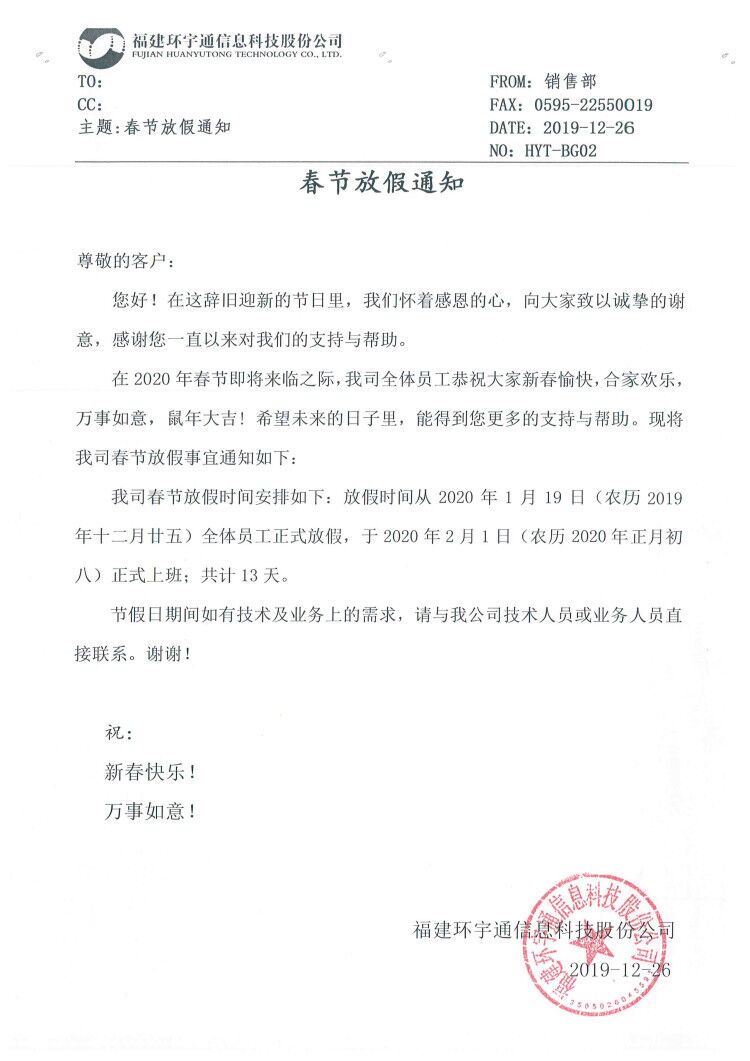 在此首先對新老客戶們致以誠摯的新年祝福:鼠年康強(qiáng),心想事成,道運(yùn)亨通! 我司決定于2020年1月19日(農(nóng)歷二零一九年十二月廿五)正式放假,于2020年2月1日(農(nóng)歷二零二零年正月初八)恢復(fù)正式上班,共計(jì)13天,期間如有技術(shù)或者業(yè)務(wù)需求可以與我司相關(guān)人員聯(lián)系,給您帶來的不便敬請諒解。(附放假表)