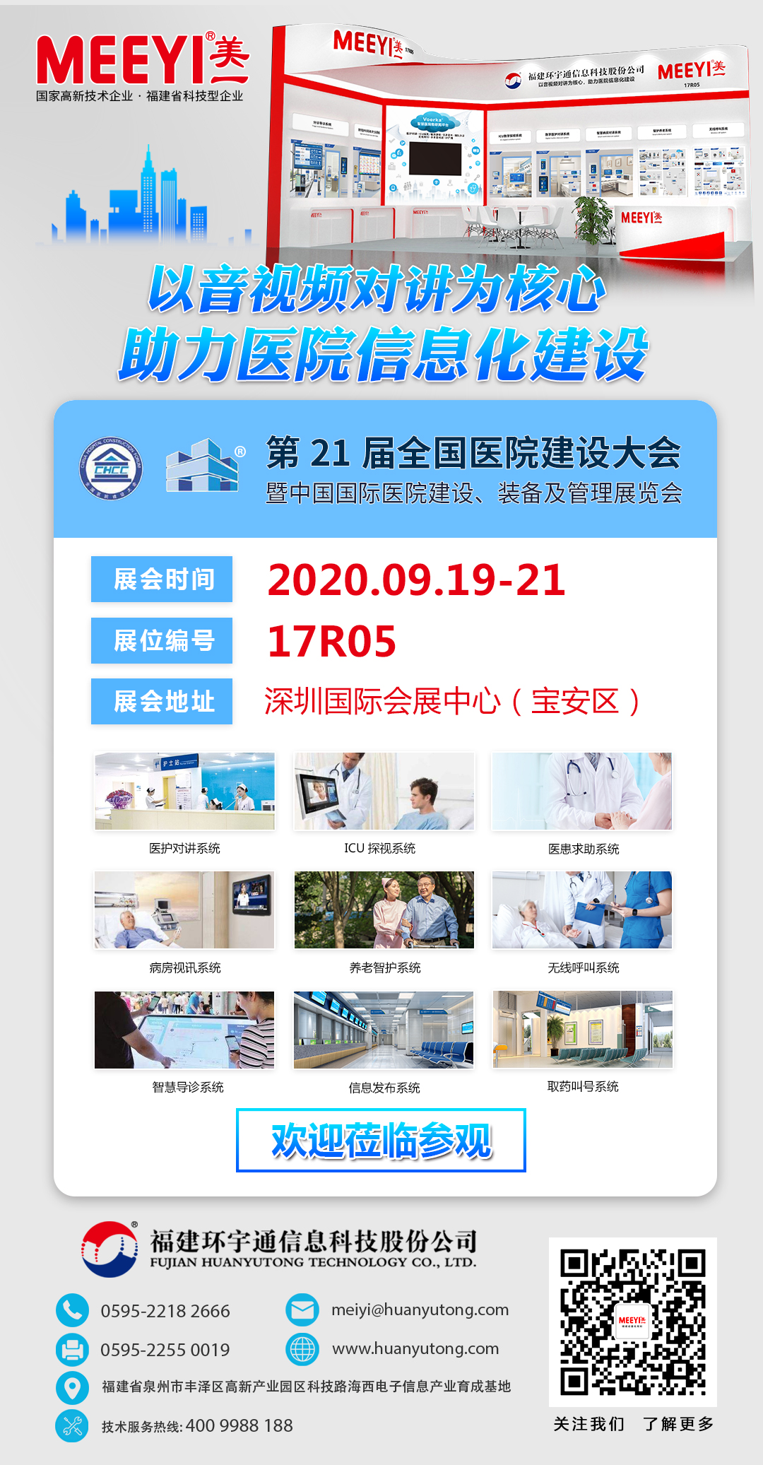 福建環(huán)宇通信息科技股份公司作為應(yīng)邀參展企業(yè),將攜多款智慧醫(yī)養(yǎng)系統(tǒng)亮相展會(huì),包括了醫(yī)護(hù)對(duì)講、ICU探視、醫(yī)患求助、床旁交互、分診排隊(duì)、取藥叫號(hào)、信息發(fā)布、病房視訊等系統(tǒng);最新研制的E6智慧醫(yī)養(yǎng)系統(tǒng),結(jié)合了前沿的物聯(lián)網(wǎng)、大數(shù)據(jù)、人工智能、無(wú)線通訊等新技術(shù),實(shí)現(xiàn)了醫(yī)護(hù)設(shè)備的智能化升級(jí),可有效提高醫(yī)療服務(wù)質(zhì)量,推動(dòng)智慧醫(yī)院建設(shè)。屆時(shí)誠(chéng)邀各參展商及客戶朋友們前來(lái)17R05號(hào)展位參觀,與我們攜手共建智慧醫(yī)院美好未來(lái)。