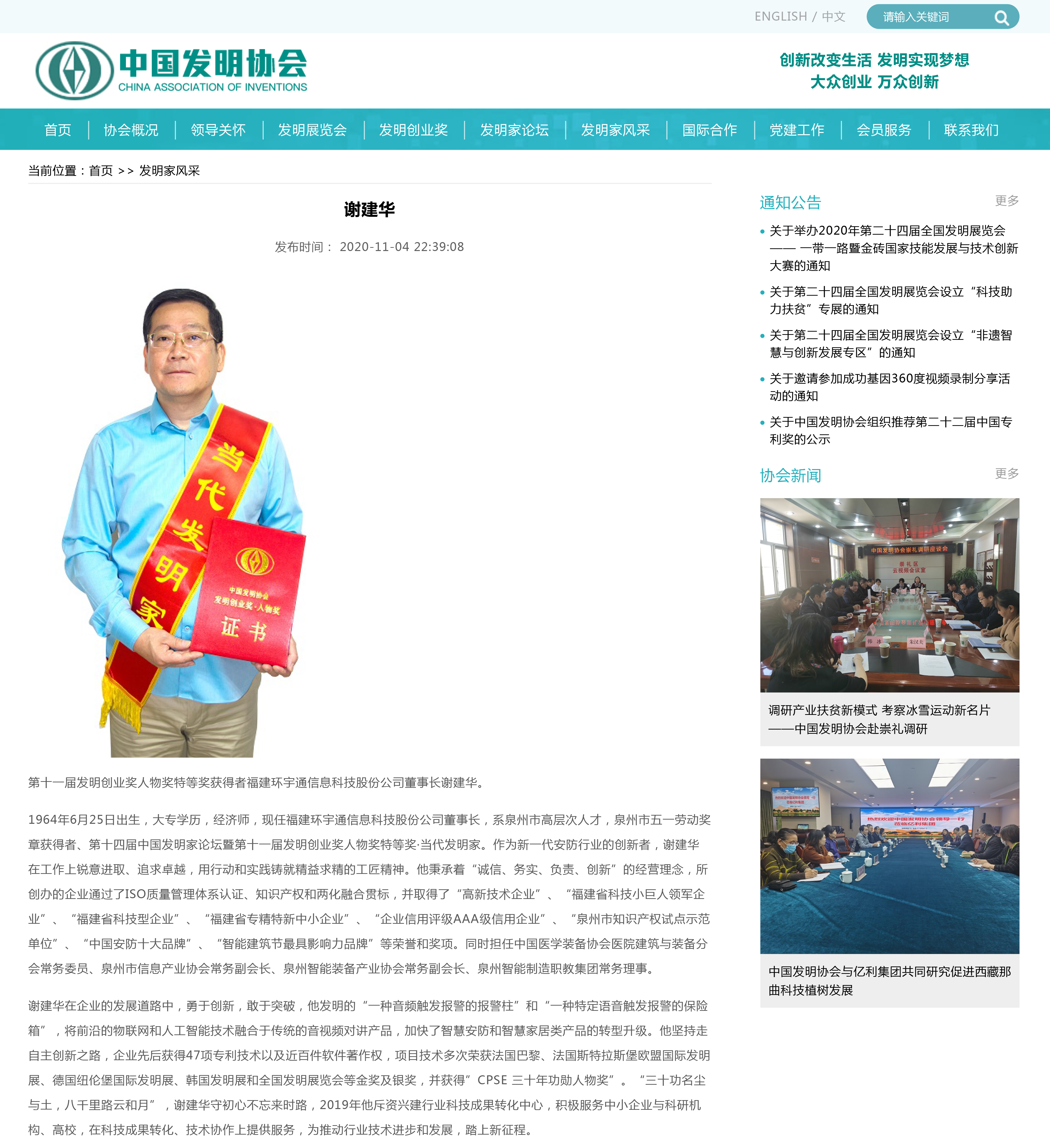 第十一屆發(fā)明創(chuàng)業(yè)獎人物獎特等獎獲得者福建環(huán)宇通信息科技股份公司董事長謝建華。 1964年6月25日出生,大專學(xué)歷,經(jīng)濟(jì)師,現(xiàn)任福建環(huán)宇通信息科技股份公司董事長,系泉州市高層次人才,泉州市五一勞動獎?wù)芦@得者、第十四屆中國發(fā)明家論壇暨第十一屆發(fā)明創(chuàng)業(yè)獎人物獎特等獎·當(dāng)代發(fā)明家。作為新一代安防行業(yè)的創(chuàng)新者,謝建華在工作上銳意進(jìn)取、追求卓越,用行動和實踐鑄就精益求精的工匠精神。他秉承著“誠信、務(wù)實、負(fù)責(zé)、創(chuàng)新”的經(jīng)營理念,所創(chuàng)辦的企業(yè)通過了ISO質(zhì)量管理體系認(rèn)證、知識產(chǎn)權(quán)和兩化融合貫標(biāo),并取得了“高新技術(shù)企業(yè)”、“福建省科技小巨人領(lǐng)軍企業(yè)”、“福建省科技型企業(yè)”、“福建省專精特新中小企業(yè)”、“企業(yè)信用評級AAA級信用企業(yè)”、“泉州市知識產(chǎn)權(quán)試點示范單位”、“中國安防十大品牌”、“智能建筑節(jié)最具影響力品牌”等榮譽(yù)和獎項。同時擔(dān)任中國醫(yī)學(xué)裝備協(xié)會醫(yī)院建筑與裝備分會常務(wù)委員、泉州市信息產(chǎn)業(yè)協(xié)會常務(wù)副會長、泉州智能裝備產(chǎn)業(yè)協(xié)會常務(wù)副會長、泉州智能制造職教集團(tuán)常務(wù)理事。