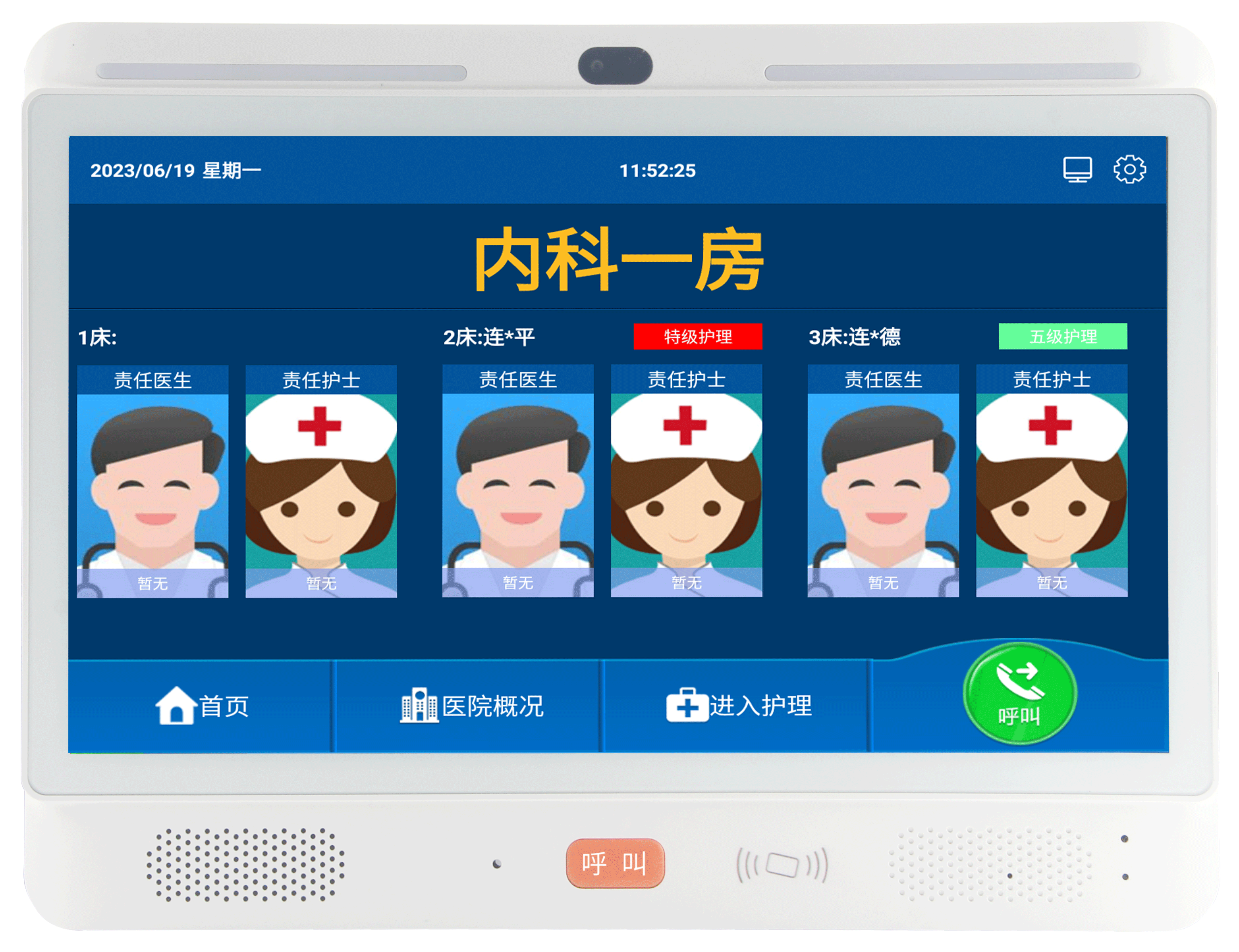 首頁界面顯示病房名稱、病床患者詳情、責任醫(yī)生、責任護士、日期時間等信息;