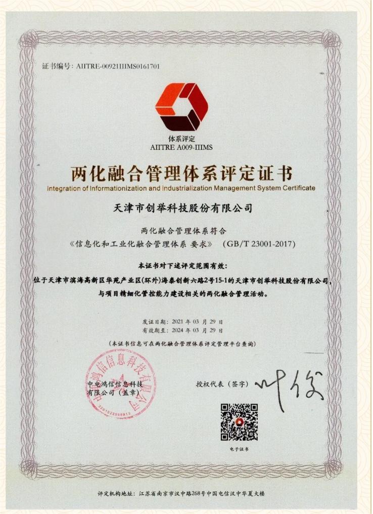 創舉榮譽 | 榮獲國家工信部“兩化融合管理體系評定證書”